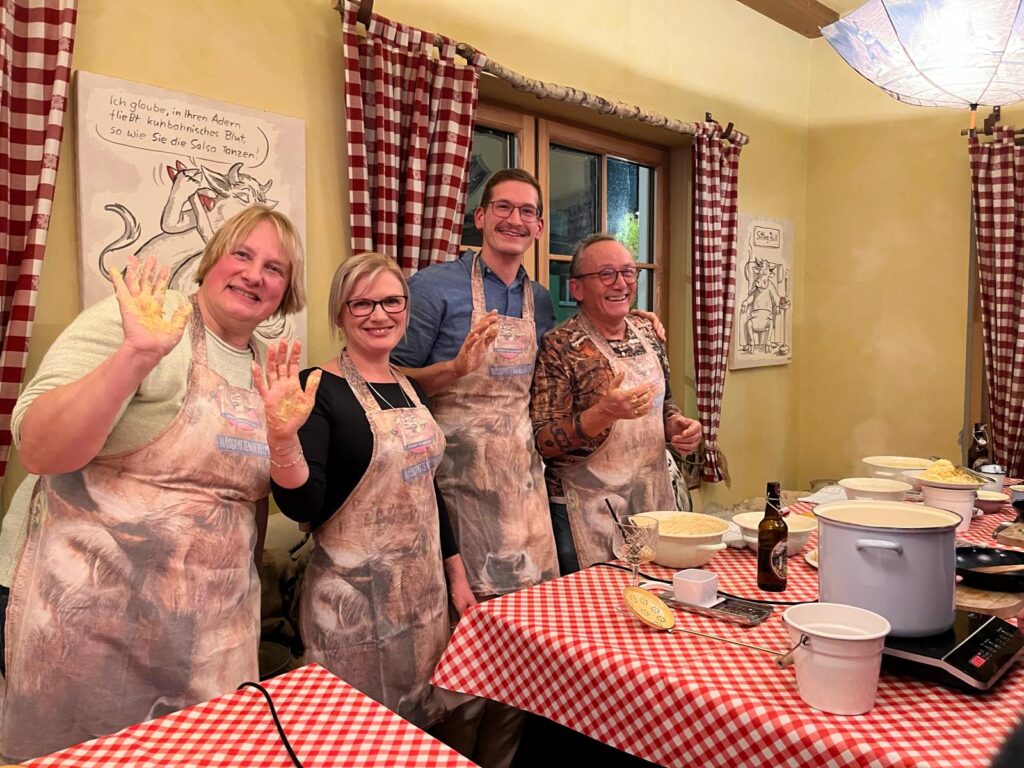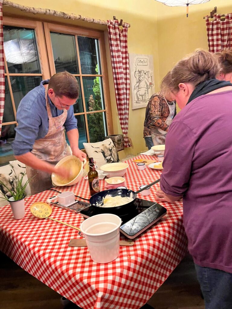 Was für eine Gaudi, die Mitarbeiter der „glücklichen Kuh“ in Schlat gaben sich große Mühe uns die Feinheiten des Käsespätzle-Kochens beizubringen, inkl. Käseverkostung.